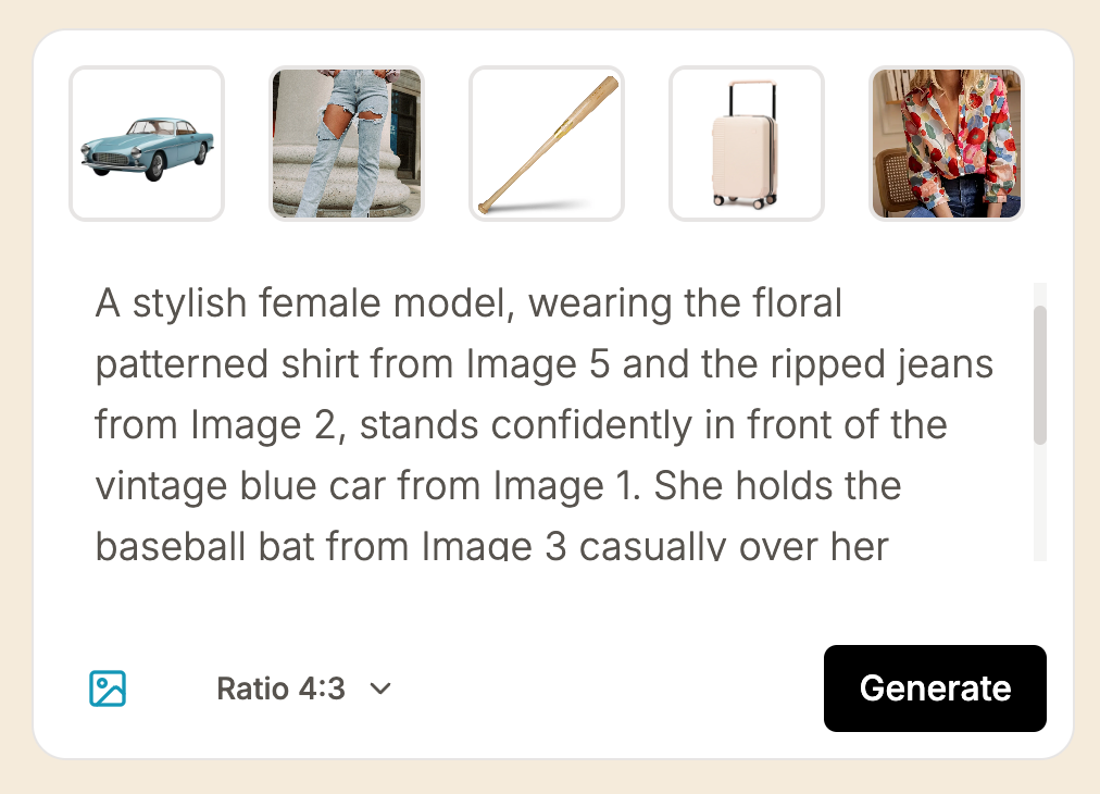 Upload one or more reference images — these will guide the composition or replacement. - Write a Descriptive Prompt