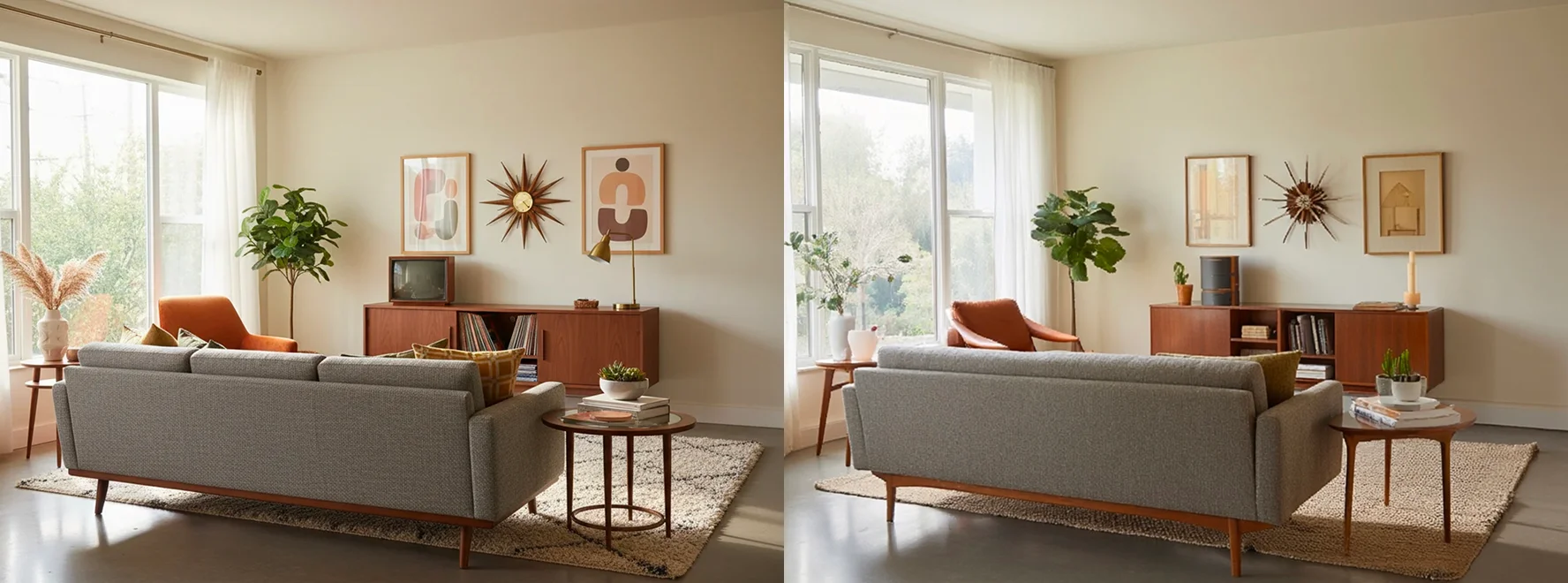| Image to Image | Test precision editing and style control. | “Replace the sofa in this room with a green mid-century sectional. Keep the lighting and perspective consistent.” | |