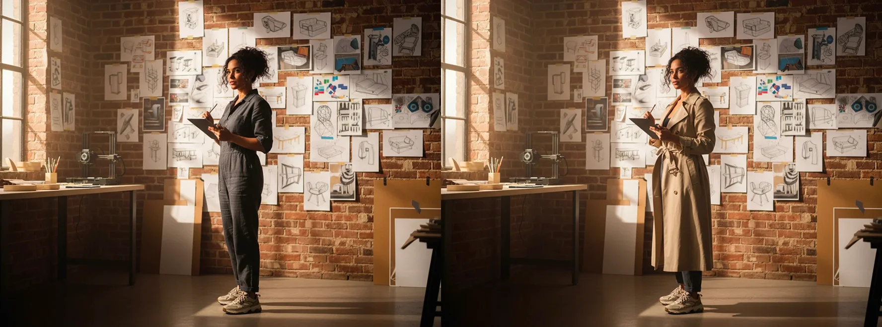 | Image to Image | Evaluate localized control and realistic blending. | “Change the model’s outfit to a beige trench coat while keeping the lighting and pose identical.” | |